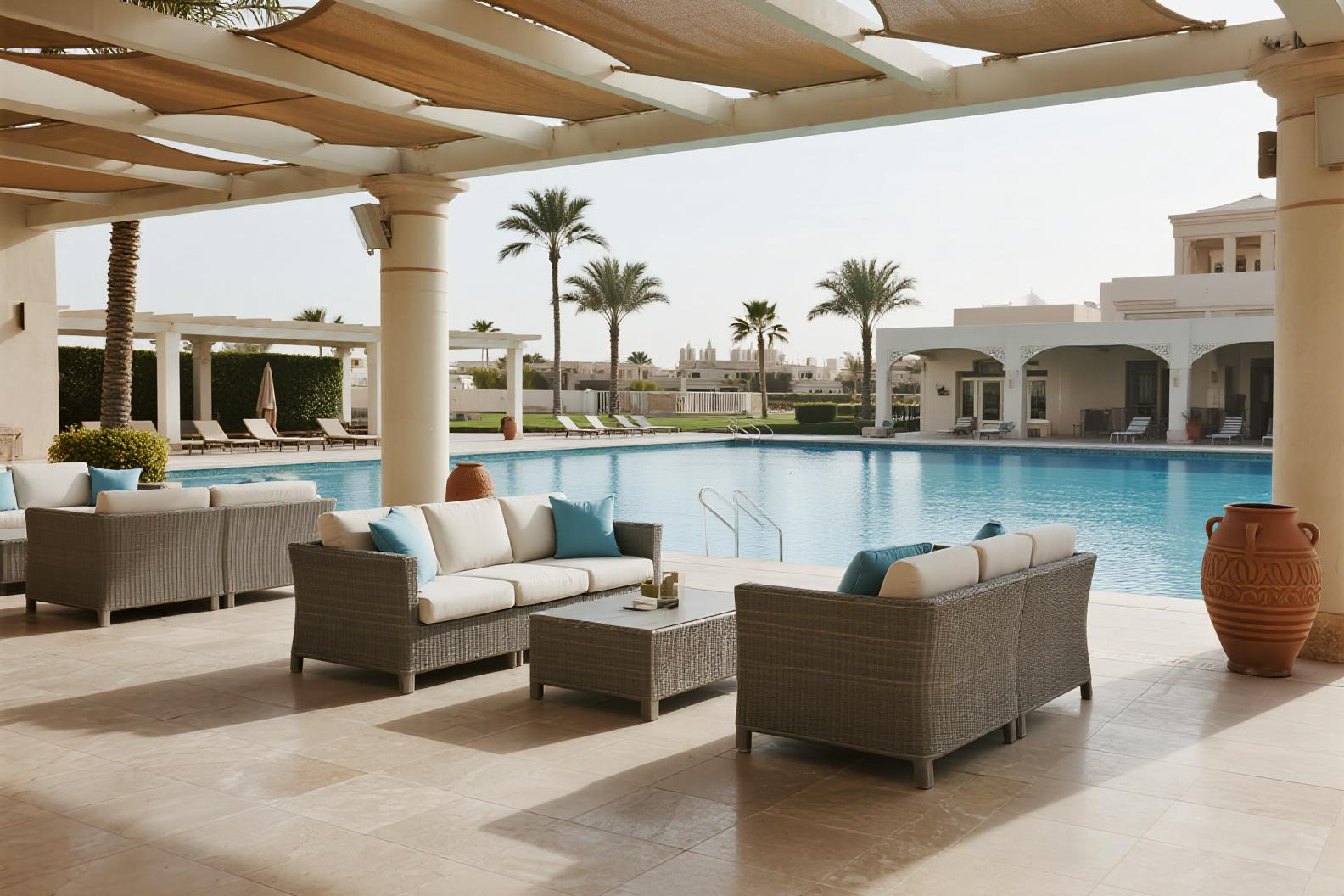 كيفية تحويل الفناء الخارجي في فيلا فاخرة بدبي إلى مساحة راقية وعصرية باستخدام الأثاث الفاخر.